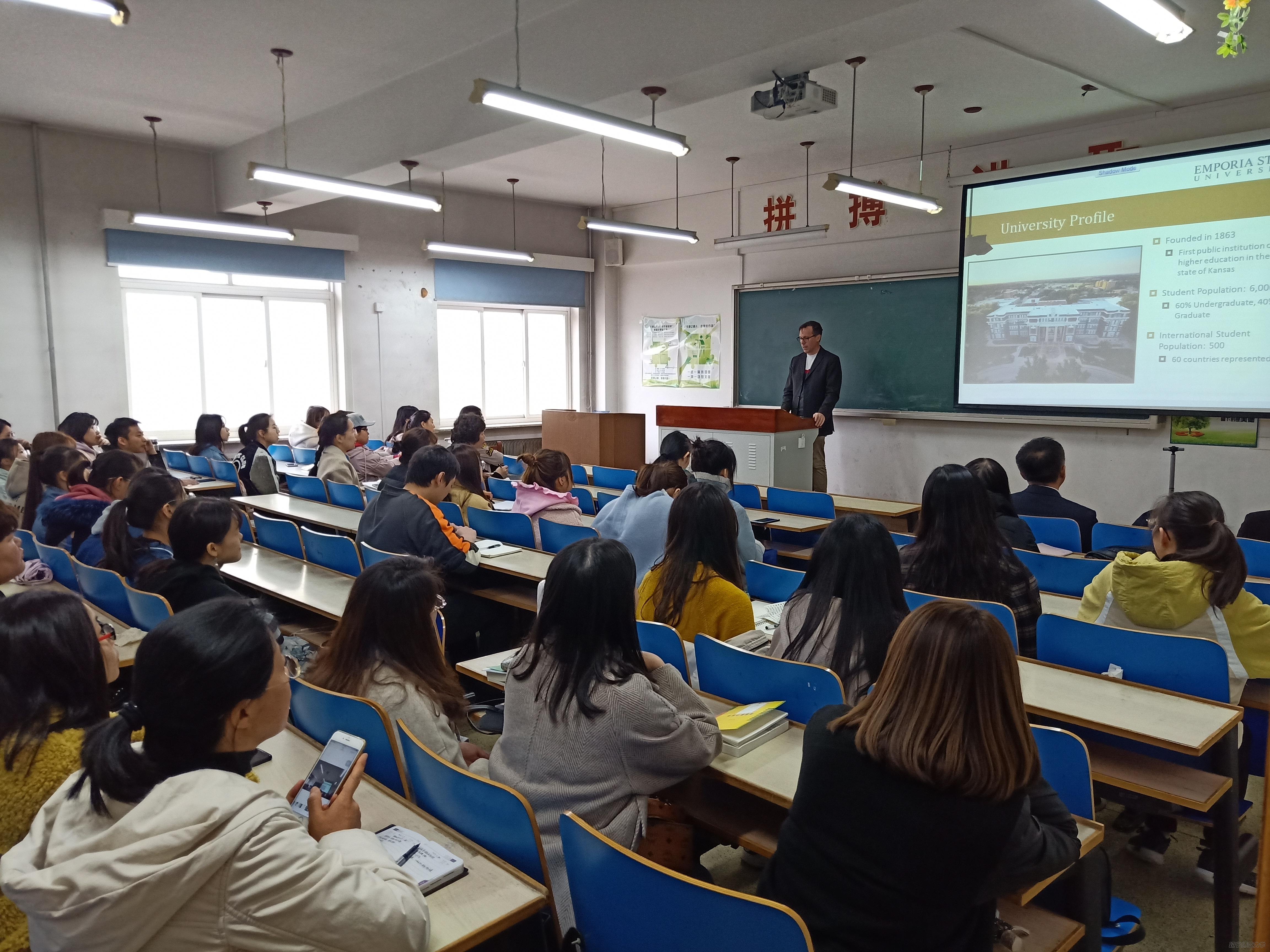 同日,Mark Daly博士在田家炳教育书院为有意向了解恩波利亚州立大学交换生项目的学生进行了项目介绍。Mark Daly博士介绍了恩波利亚州立大学的留学生生活,并指出许多参加该项目的同学现已学成归国,找到了不错的工作,更有许多同学以此交流项目为基础申请到了美国名校的硕士和博士研究生。希望通过该项目的开展,为我校学生提供更好的国际交流平台,创造更多了解世界的机会。